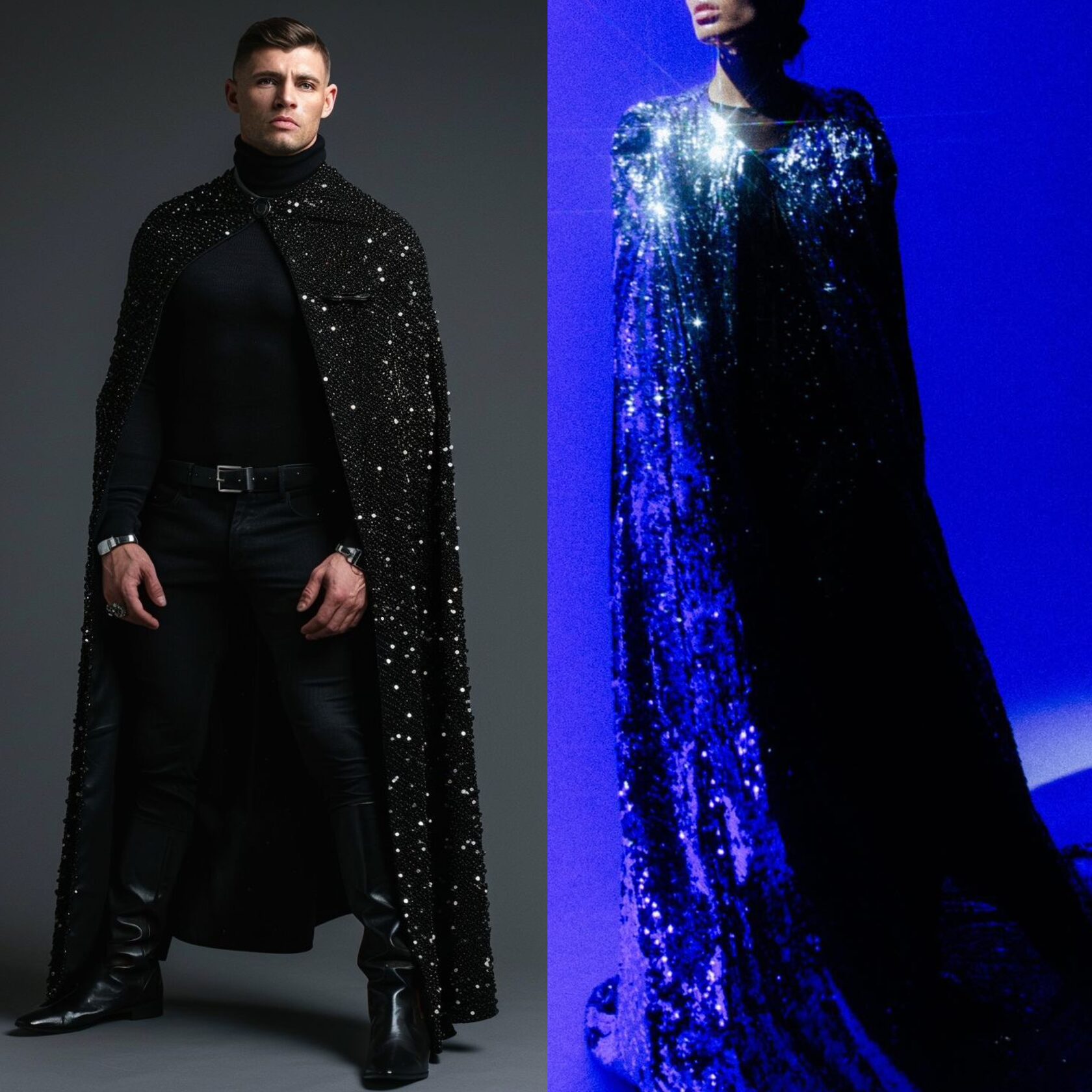 Чёрный низ и блестящий плащ