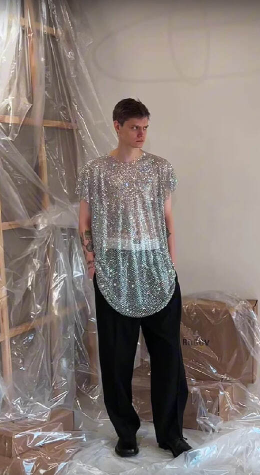 Блестящая серая туника, под